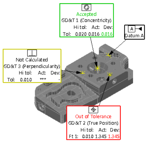 In PowerInspect können den Prüfsequenzen geometrischer Bemaßungen und Toleranzen (GD & T) hinzugefügt werden. Ein Benutzerassitent führt durch den gesamten Prozess. Die umfassenden Funktionen von GD & T beinhalten: