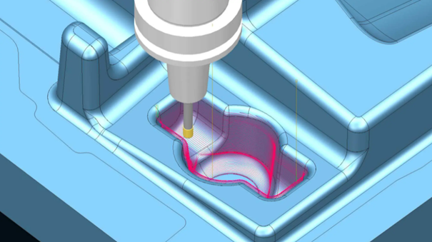 Geometrie o stromych powierzchniach bocznych, prostych powierzchniach dolnych oraz promieniach wejścia i wyjścia – takie jak żebra i rowki – można teraz obrabiać automatycznie, z równomiernym krokiem i stałym Z za pomocą funkcji „WYKAŃCZANIE POWIERZCHNI”, bez ruchów wycofania, bez dodatkowych zabiegów projektowych i z zachowaniem doskonałej jakości.