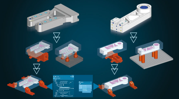 Każdy zaimportowany zestaw danych CAD musi zostać przygotowany do programowania CAM. Zwykle obejmuje to wiele pojedynczych etapów pracy: np. muszą zostać umieszczone otwory pod systemy mocujące, zaprojektowane powierzchnie zaślepiające, utworzone przygotówki, spozycjonowane urządzenia mocujące i zdefiniowane płaszczyzny wycofania. Te wiele pojedynczych kroków można w Tebis wysoce zautomatyzować za pomocą parametrycznych szablonów CAD. Szablony te można w razie potrzeby rozszerzać i dostosowywać do specyficznych wymagań użytkownika. Użytkownicy mogą nadal być bardzo elastyczni: zmiany, takie jak wybór innego systemu mocowania, można teraz kontrolować bezpośrednio i wygodnie za pomocą parametrów użytkownika w drzewie obiektów.