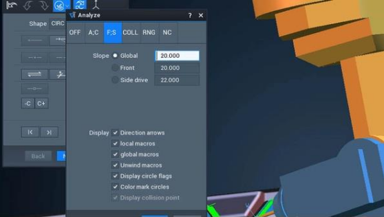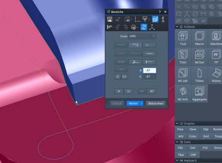 Tebis wspiera użytkownika wieloma funkcjami analizy podczas interaktywnego programowania okrawania. Użytkownik zawsze zachowuje możliwość podglądu kąta obrotu i obszaru, kierunku pochylenia narzędzia i kolizji. Ułatwia to optymalizację ruchów obrotowych maszyny w 5 osiach dla szybkiego i płynnego przycinania. Można również dostosować swoje projekty produkcyjne do ograniczeń kąta osi i nieuniknionych ruchów odwijania maszyny.